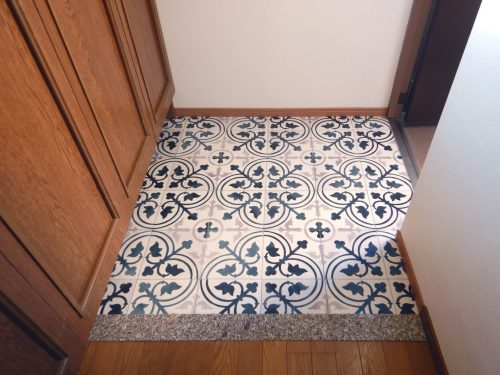 玄関の結露で傷んだ壁・天井・床の内装を貼替えて明るくなり、イメージが一新!玄関床はアンティークの風合いを演出した伝統的なタイル柄です。
